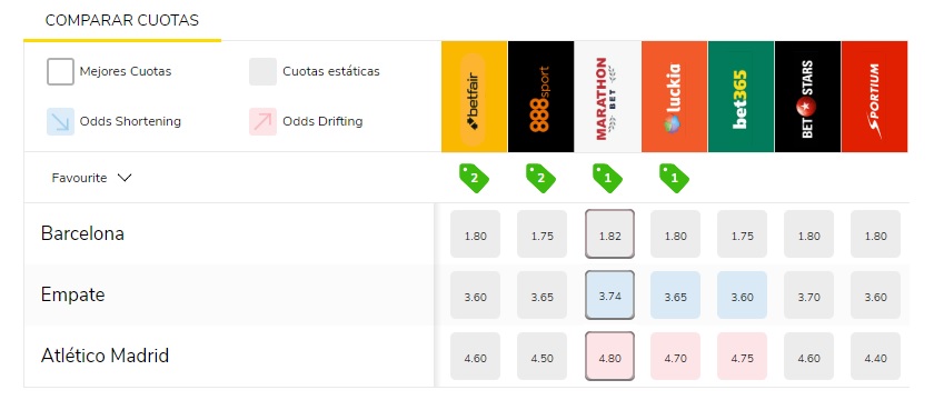 Si de algo sabemos en Oddschecker es de comparar las mejores cuotas de apuestas y podemos afirmar con seguridad que Marathonbet ofrece con mucha frecuencia los precios más competitivos del mercado español. Expertos en apuestas de fútbol, es muy común encontrarlos en lo más alto de nuestra parrilla en cualquier apuesta. Así lo demuestran en sus habituales combinadas de la jornada, en las que eligen tres selecciones de LaLiga al mercado de ganador por un valor global que rara vez consigue igualar el resto de operadores.